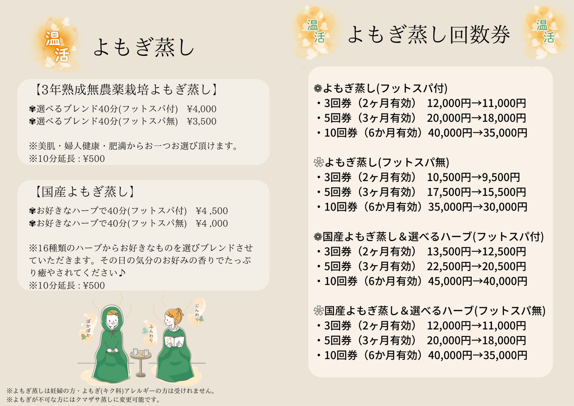選べるハーブ国産よもぎ蒸し40分(フットスパ無)通常¥4,000/1回の回数券。